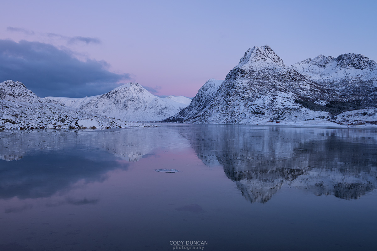 Arriving around noon, the clear weather had brought arctic temperatures, much colder than we had on Lofoten! I found a place to park by the cemetery and then we began our hike into the frozen landscape. We only had rough directions, and the cold made these difficult to follow. At first we tried to go the direct route, across some tidal rocks at the end of a fjord, but the water was too high and the rocks too icy, so we needed another 45 minutes to make a detour around the end of the fjord, before picking up the trail again.